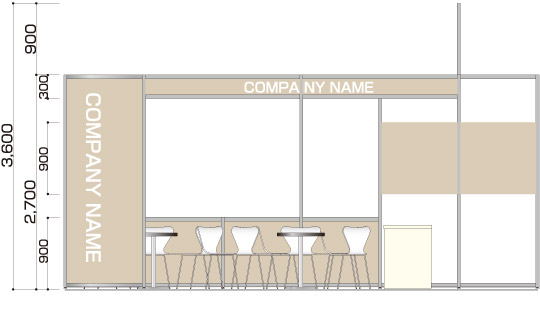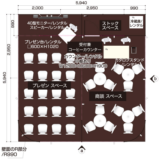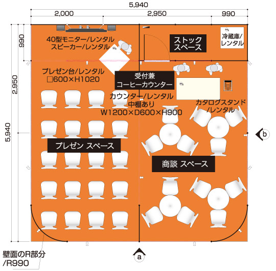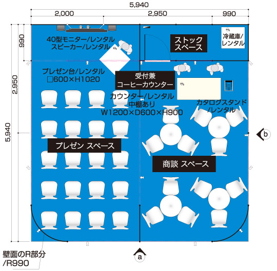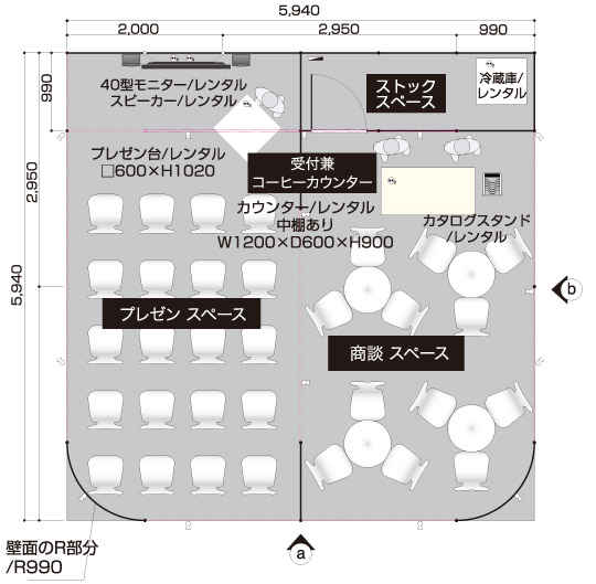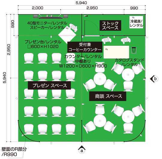 商談席×4、受付兼コーヒーカウンター、貴名受け、文房具、カタログスタンド
