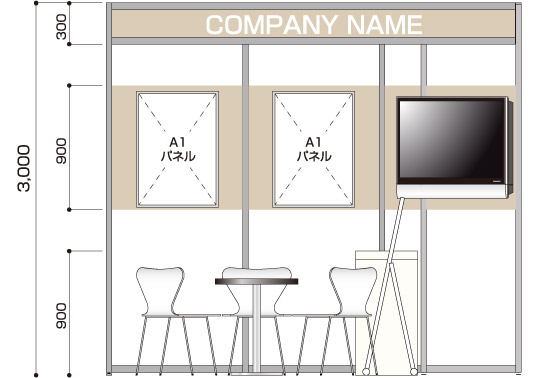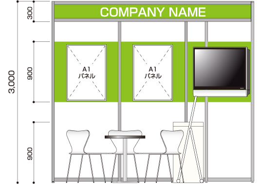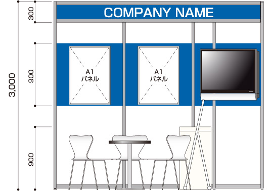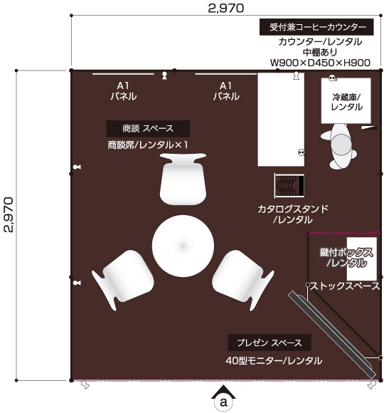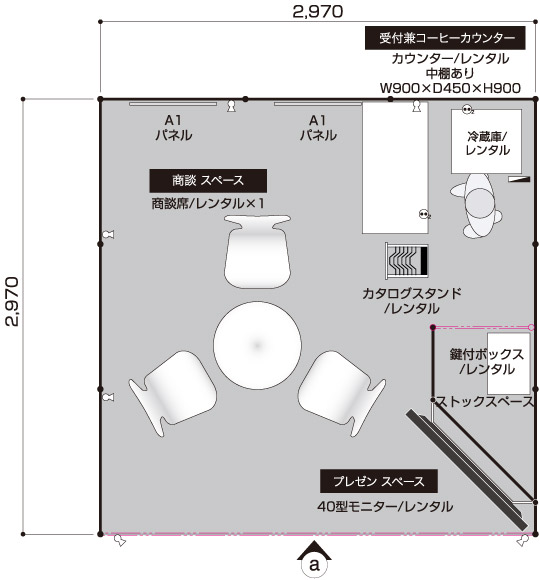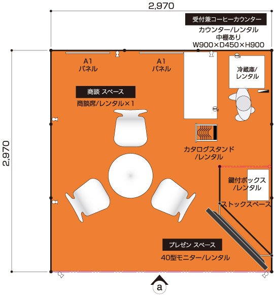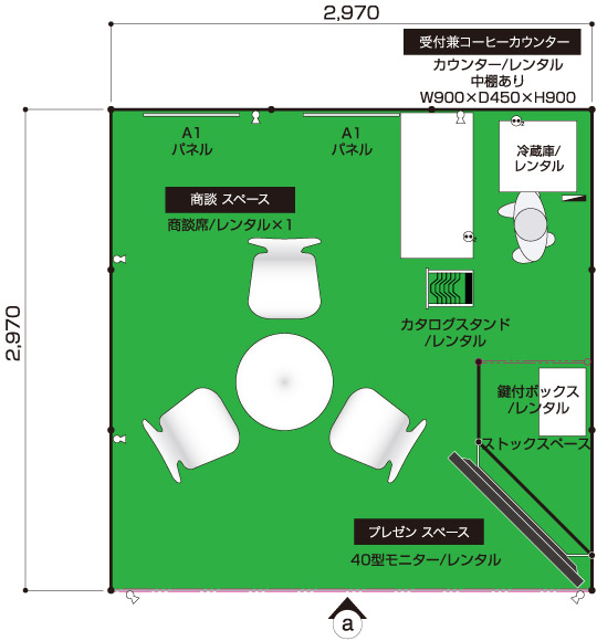 商談メイン 医薬品や製薬など、商談メインのクライアント 展示会コンパニオン 1名 1コマ 1面アキ 40型モニター ×1 商談席×1、受付兼コーヒーカウンター×1、貴名受け、文房具、鍵付きボックス、カタログスタンド 冷蔵庫、コーヒーメーカー、コーヒーセット、コーヒー用ミネラルウォーター、飲料用ミネラルウォーター 壁面のカラーシート貼り(1色のみ)、社名サイン スポットライト×6、2口コンセント×2 A1サイズパネル×2(完全データ入稿) 白布 ※壁面は、全面カラーもご指定いただけます。