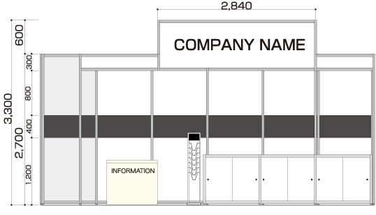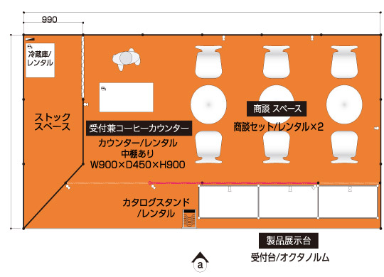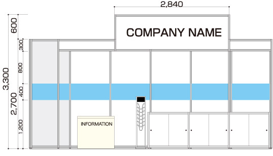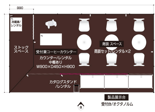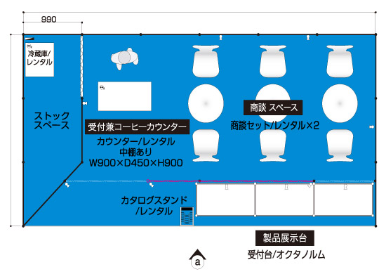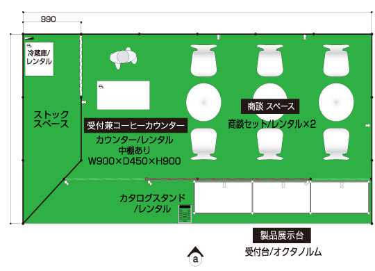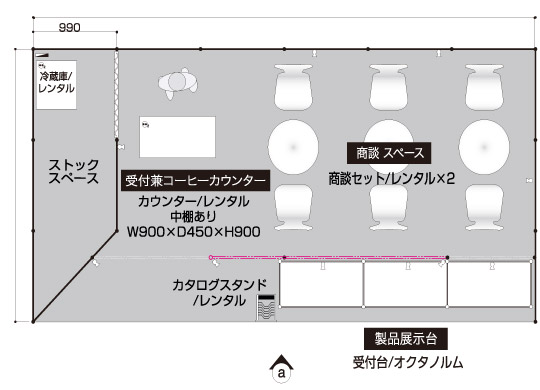 製品配布メイン 食品、化粧品メーカーなどで通路に立って試食品やサンプル配布を行うクライアント 展示会コンパニオン 4名 アシスタントディレクター(AD) 1名 2コマ 1面アキ 商談席×3、受付兼コーヒーカウンター、貴名受け、文房具、カタログスタンド 冷蔵庫、コーヒーメーカー、コーヒーセット、コーヒー用ミネラルウォーター、飲料用ミネラルウォーター 壁面のカラーシート貼り(1色のみ)、社名サイン スポットライト×10、2口コンセント×2 展示台W990D495H900×3 白布 ※壁面は、全面カラーもご指定いただけます。